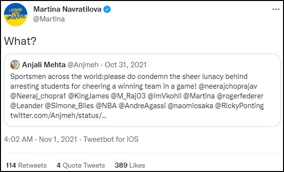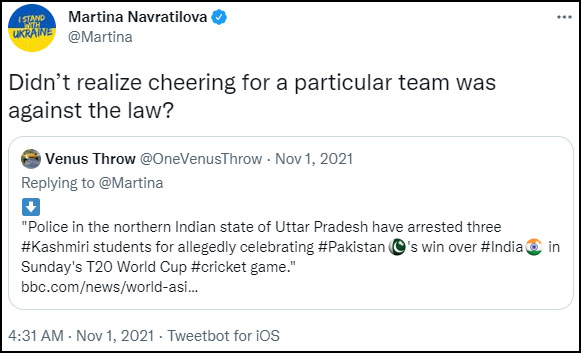Navratilova reacted to a post where a Twitter user named Anjali Mehta (ex-army now a social activist as per her Twitter bio) tagged several sportspersons from across the globe to condemn the arrests being made in India of students who celebrated Pakistan’s win.