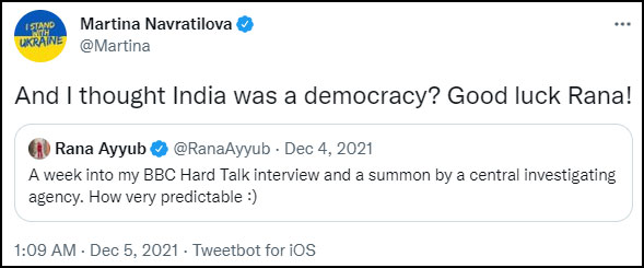 In December 2021, Rana Ayyub claimed that she was sent a summon by the central government agencies because she gave an interview against the government to BBC. Again, Martina stepped in, questioned democracy in India, and wished her good luck.