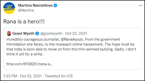 The first mention that we noticed where Martina hailed Rana Ayyub was in October 2021. She quoted columnist Grant Wyeth who had praised Rana Ayyub for her “courageous” reporting in India against the BJP-led central government. Martina deemed Rana a hero in her tweet.