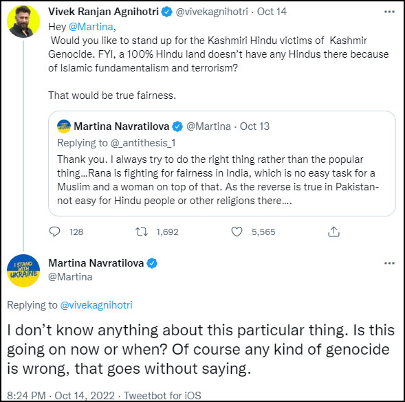 On October 13, filmmaker Vivek Agnihotri tagged Martina and asked if she was aware of the genocide and exodus of Hindus from Kashmir Valley. He said, “Would you like to stand up for the Kashmiri Hindu victims of the Kashmir Genocide. FYI, a 100% Hindu land doesn’t have any Hindus there because of Islamic fundamentalism and terrorism? That would be true fairness.”