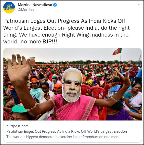In April 2019, while the Lok Sabha elections were ongoing in India, Martina hoped for BJP’s defeat. In a tweet, she shared a Huffington Post article titled, “Patriotism Edges Out Progress As India Kicks Off World’s Largest Election- please India, do the right thing. We have enough Right Wing madness in the world- no more BJP!!!” But it did not happen. BJP came back with even more seats in Parliament.