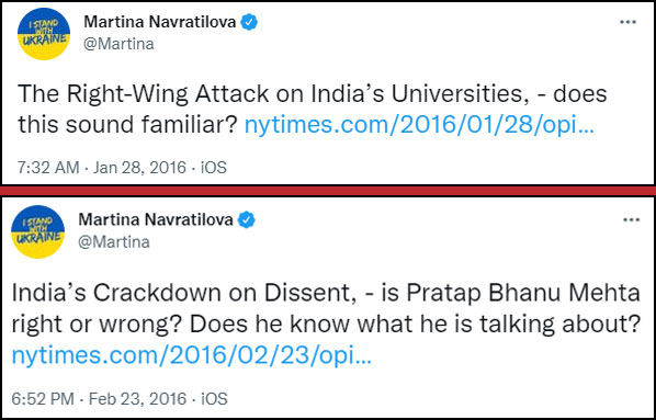 On October 21, Navratilova took potshots at the BJP government in India on the basis of fake news peddled by CJ Werleman, an Islamism apologist profiled by Shekhar Gupta’s ThePrint.