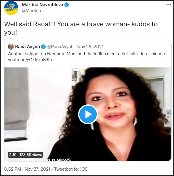 In the next tweet from November 2021, Martina quoted Rana Ayyub, the “great journalist” herself, where she had shared a video of herself talking about the “problematic past of Prime Minister Narendra Modi.” Martina praised Rana and called her ‘brave.’