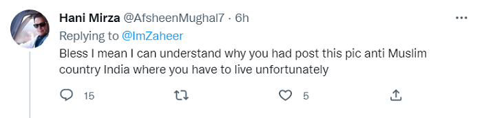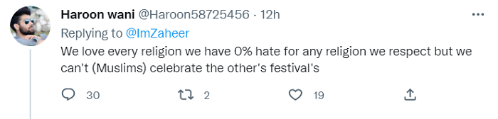 One of the users identified as Hani Mirza on Twitter called India an anti-Muslim country while ‘blessing’ the couple. “Bless, I mean I can understand why you posted this picture in an anti-Muslim country, India where you have to live, unfortunately”, he tweeted. Meanwhile, another named Haroon Wani stated that though Muslims can have a love for every religion and zero per cent hate for any particular religion, they can’t celebrate festivals celebrated by other religions.
