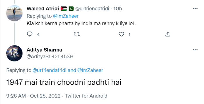 Also, one of the users identified as Waleed Afridi on Twitter could be seen attacking the former Indian cricketer on his Diwali post this year. He said that Khan had extended Diwali wishes forcefully to live in India. “Kia kuch kerna phadta hy India ma rehny k liye lol (What all a man has to do to live in India)”, the tweet read which was followed by a hilarious reply by a user who said, “1947 mai train choodni padhti hai (He has to leave the train to Pakistan in 1947)”.