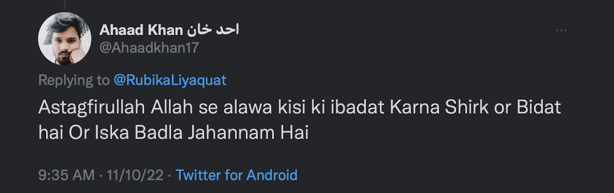 Yet another Islamist declared that Rubika is a Hindu and warned her that she should not call herself a Muslim. Citing Sharia and Islam, the social media user said those who commit shirk cease to be Muslim.