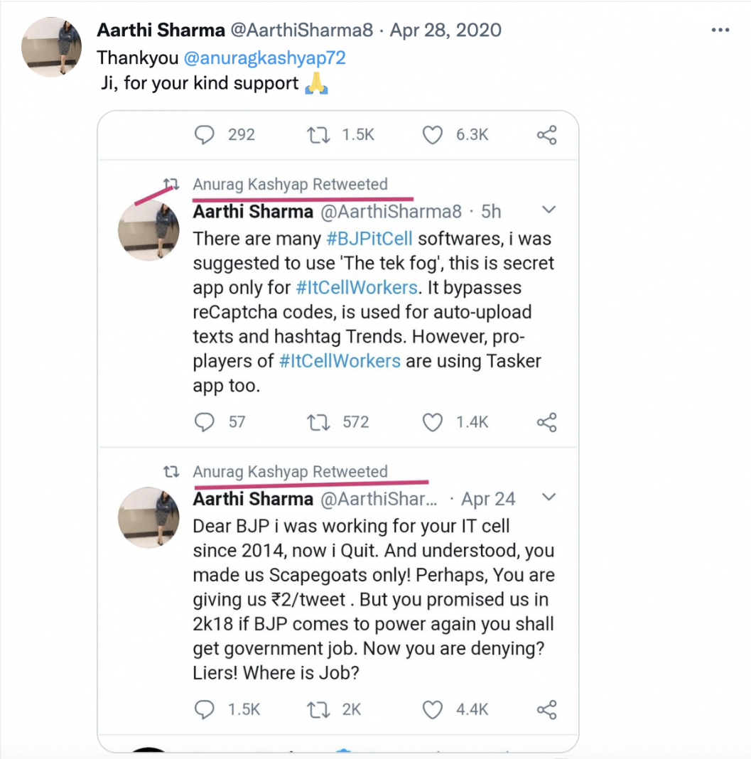 On April 28, 2020, filmmaker Anurag Kashyap retweeted her tweets. It was likely one of the first prominent accounts to retweet ‘Aarthi Sharma’.