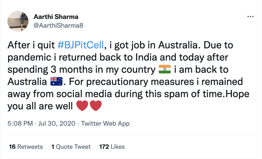 ‘Aarthi Sharma’ then claimed that they had moved to Australia. They had claimed they were employed with BJP IT Cell at least til February 2020. This is the first time they were claiming they had been employed in Australia. Australia had international travel ban and it opened its border for foreign travellers in November 2021.