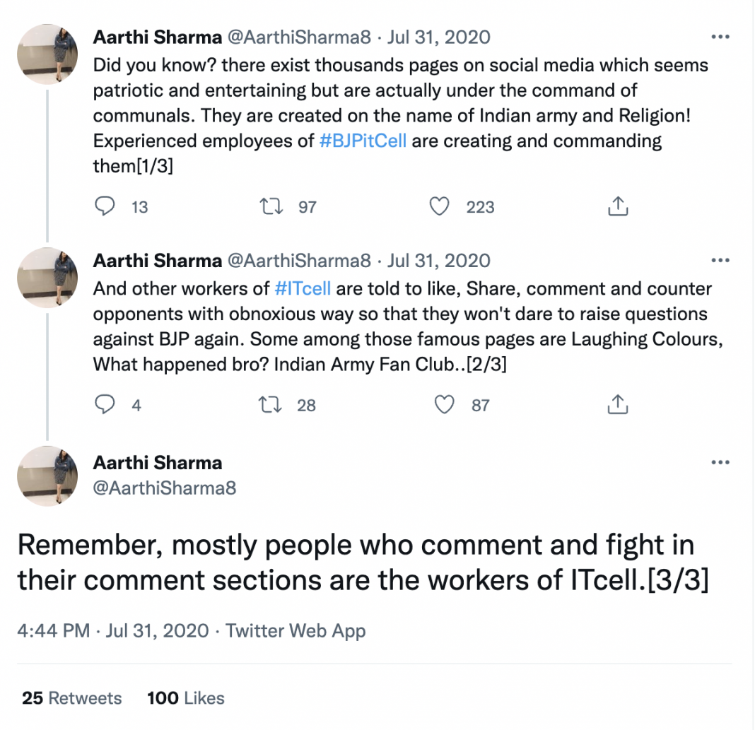 The last 3 tweets of ‘Aarthi Sharma’ claimed how most people commenting on popular Facebook pages are ‘BJP IT Cell’ workers.