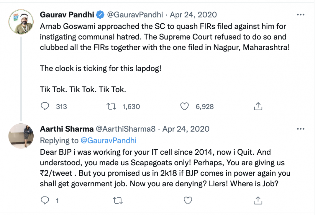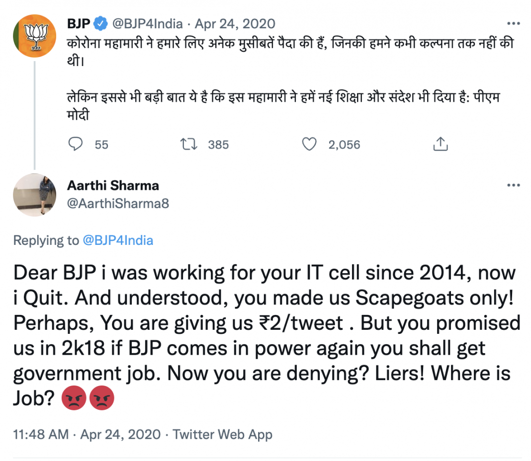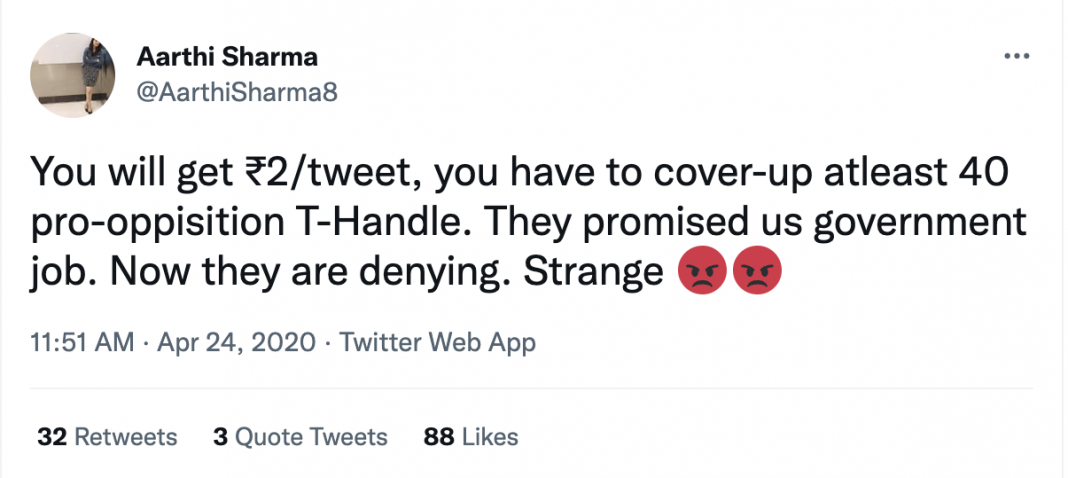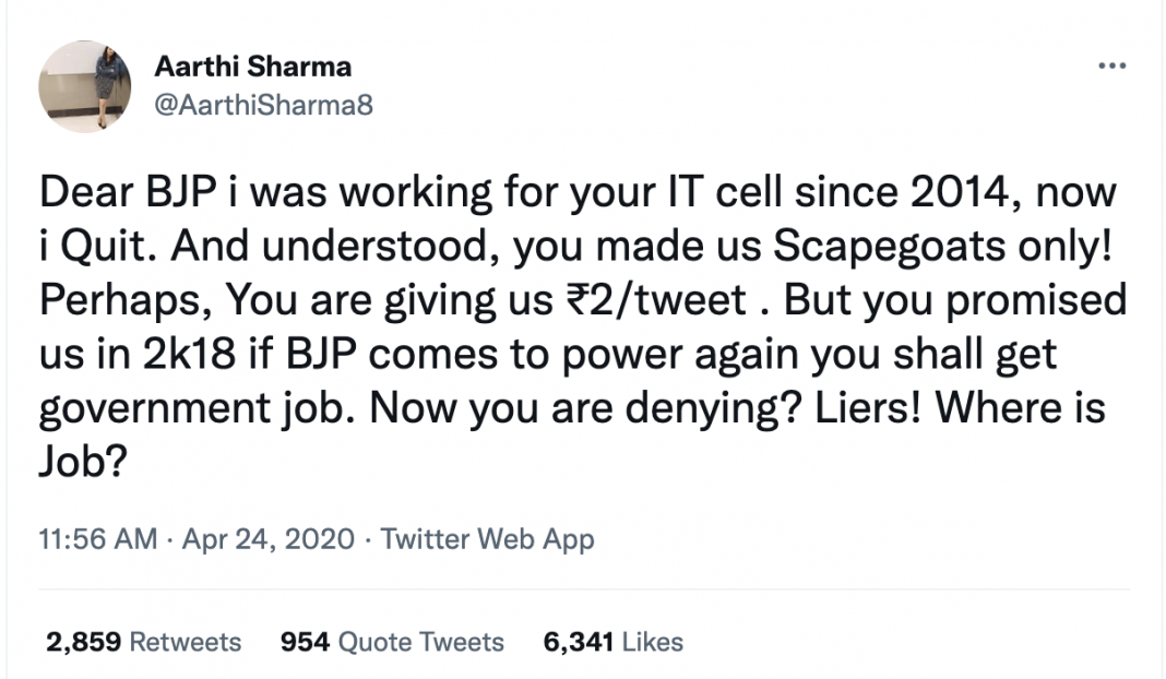 The account started tweeting on 24th April, 2020 and after initial 3-4 tweets to BJP leaders, accusing them of maligning India globally, the account responded to official BJP account and claimed they worked for the BJP IT cell. They claimed BJP paid Rs 2 per tweet to tweet in their support and how they were promised ‘government job’ should BJP return to power in 2019.