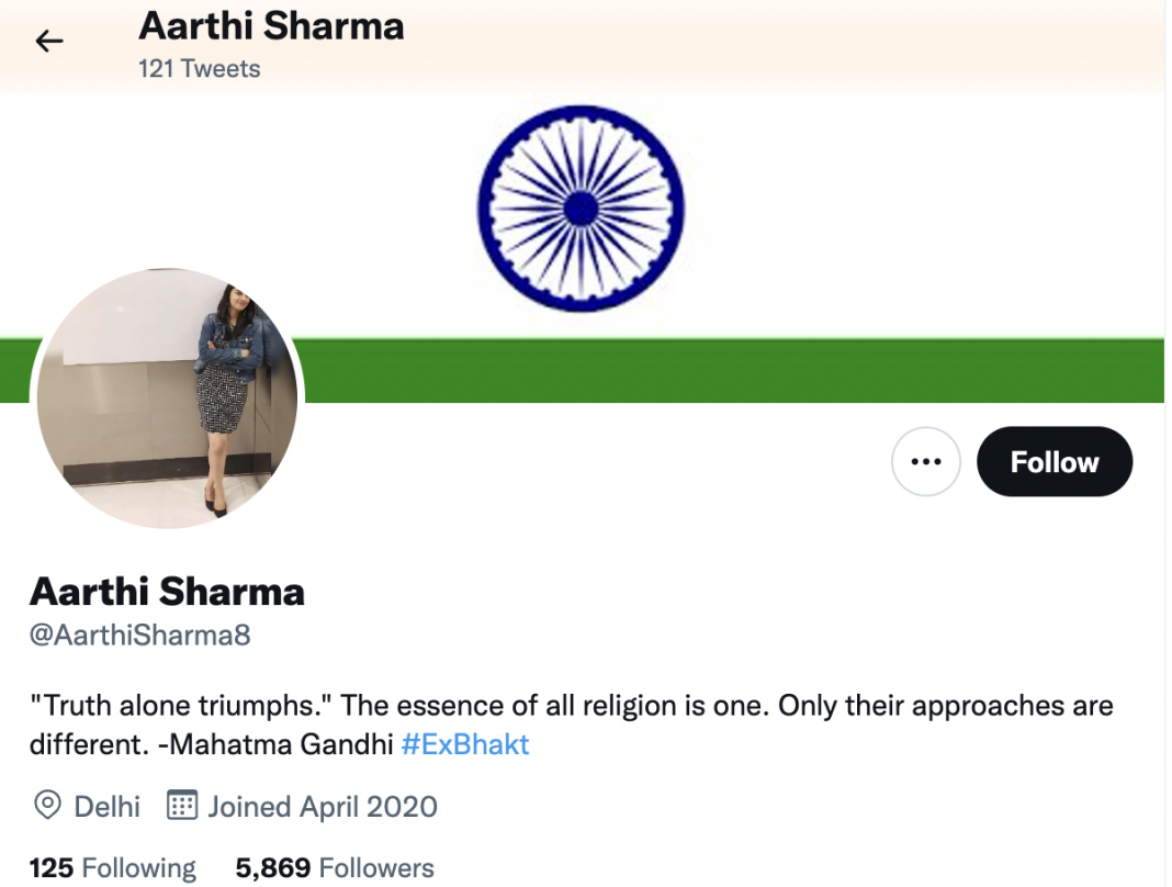 This account has only 121 tweets till now and has not tweeted since 31 July 2020. The tweets are all anti-BJP, calling PM Modi a ‘phenku’ and other things straight out of a Congress supporter’s rulebook. Which is fine if one were honest and brave enough to admit they are Congress supporters. However, ‘Aarthi Sharma’ (with an extra h in the name), has ‘ExBhakt’ in her bio to give credibility to her posts.