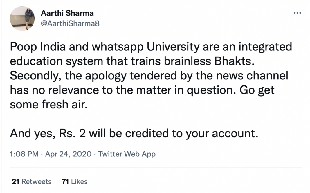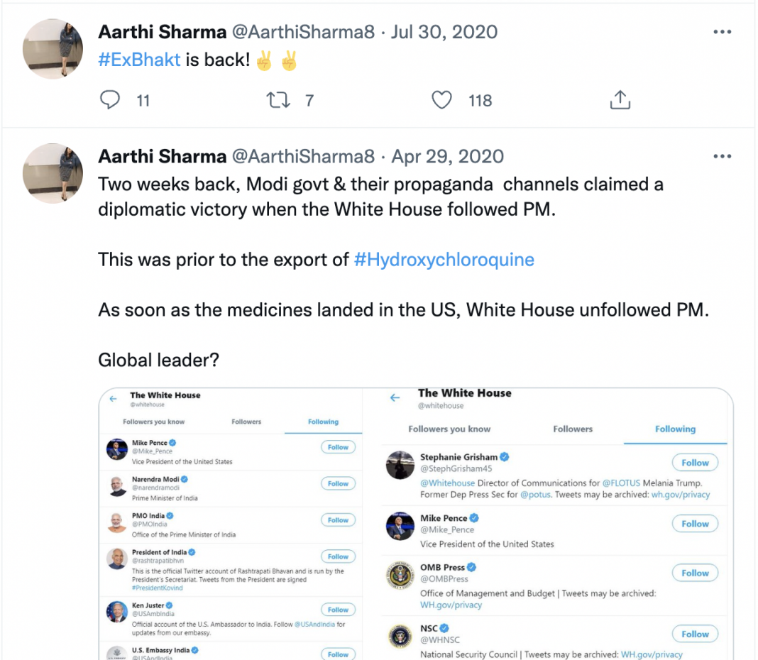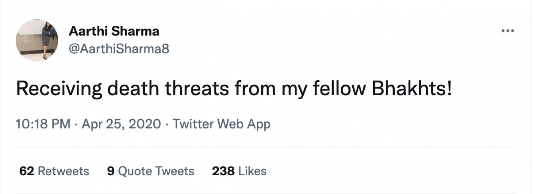 ‘Aarthi Sharma’ last tweeted on 31 July 2020.