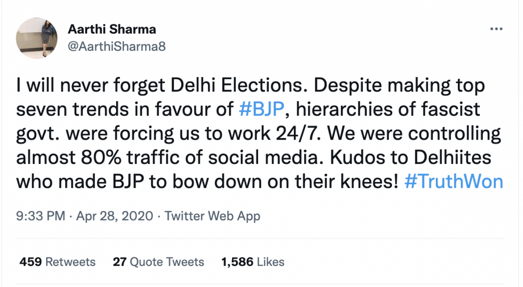 Days later it hailed how BJP had ‘hijacked’ social media traffic during Delhi elections in February 2020.