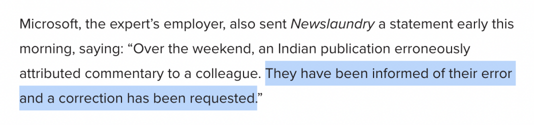 Hours after The Wire published the story and Varadarajan publicly shared the above screenshot of the mail, The Wire claimed that Kumar has now backed down from putting his name public. It turns out, Microsoft had denied Kumar being involved in the circus and had said how the mail was not sent by him. In fact, amid all this, The Wire never admitted that Microsoft had reached out to them to deny Ujjwal Kumar’s involvement in this Meta saga. It came to the fore only after another propaganda outlet, Newslaundry, put it out publicly that Microsoft had issued them a statement denying Kumar’s involvement in this.