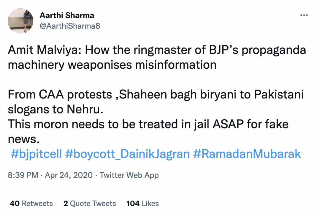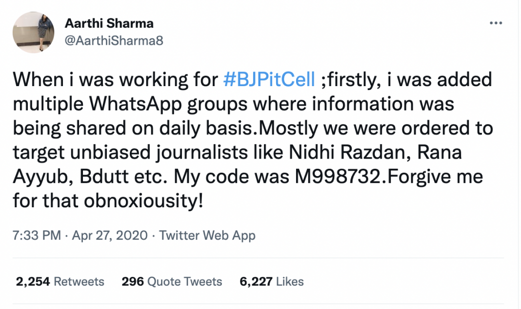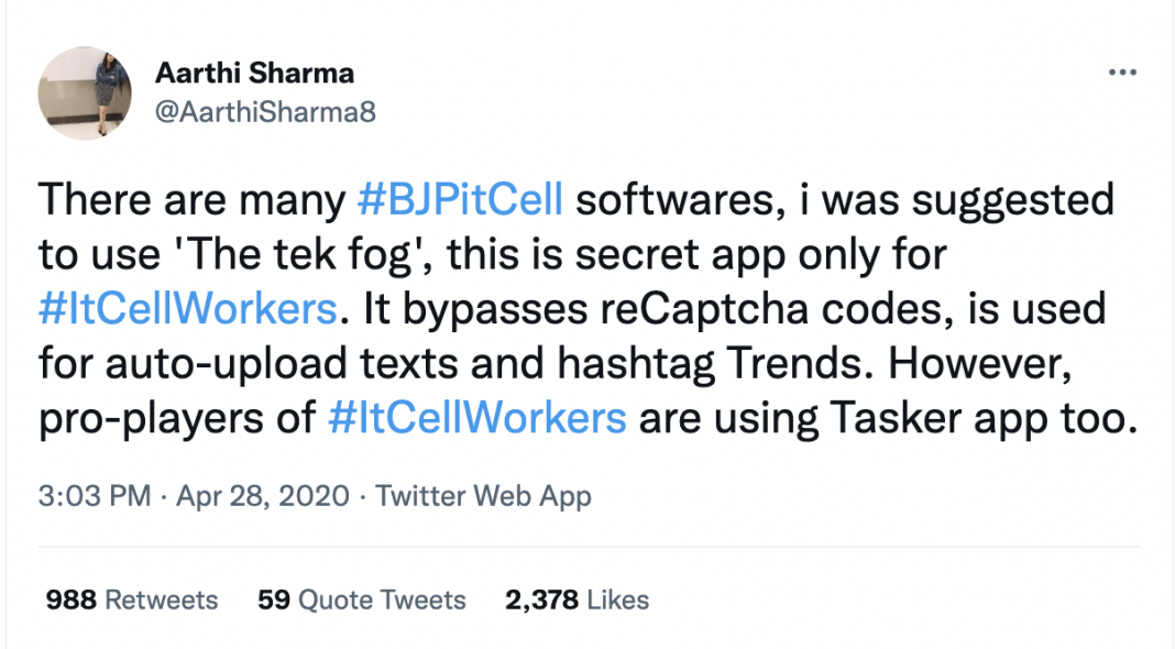 The trigger for Tek Fog were a few tweets by an absolute obscure Twitter account by the name ‘Aarthi Sharma’. The Twitter account was created in April 2020.