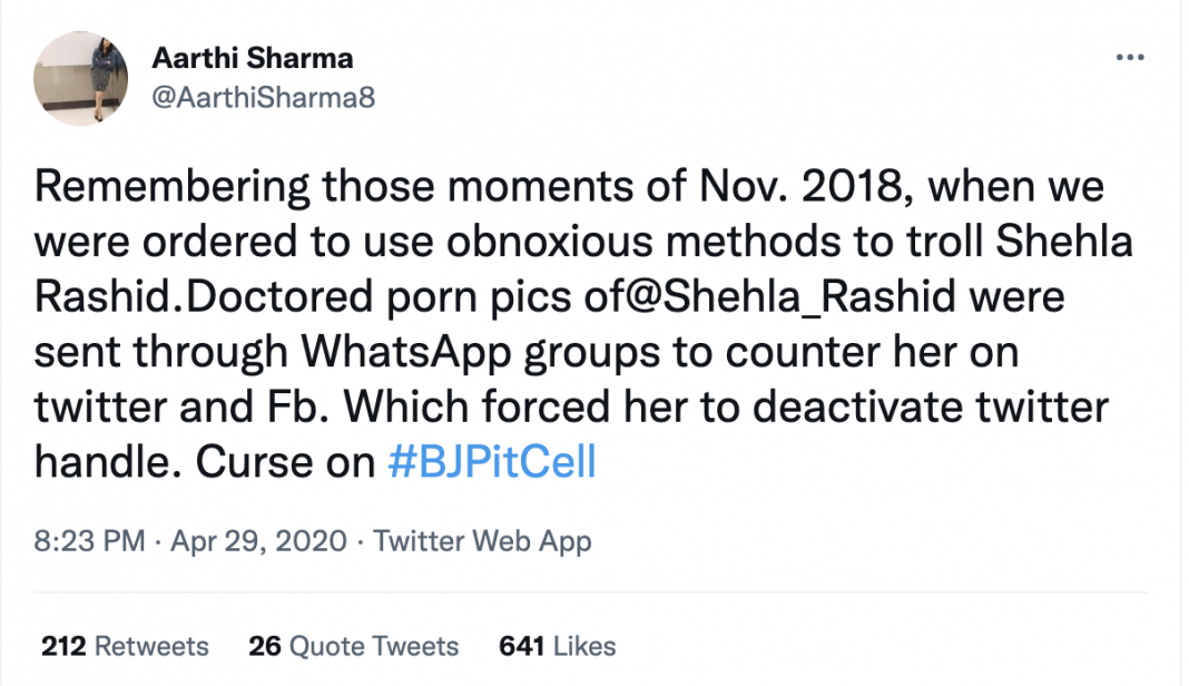 Here, ‘Aarthi Sharma’ tweets BJP IT cell asked her to troll Shehla Rashid by using doctored porn images of hers. They claim they were sent these via WhatsApp groups to ‘counter her’ on Twitter and Facebook. Except, ‘Aarthi Sharma’ got the timeline mixed up. Shehla did deactivate her Facebook account, but it was in February 2018 and not November 2018. She did so after Islamists had attacked and condemned her for saying Muslim women have the right to marry a non-Muslim man.