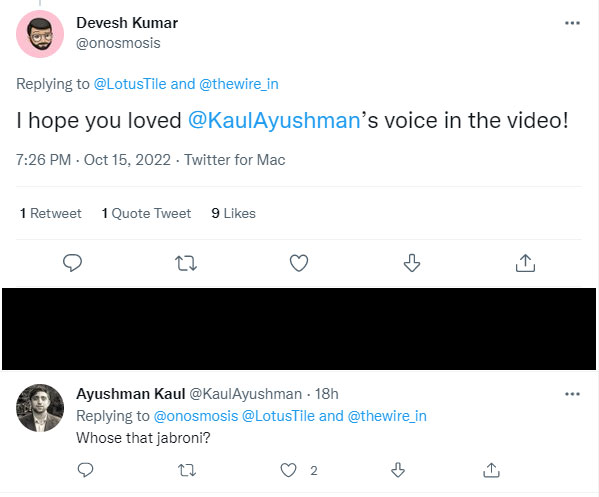 Further, remember the video shared by Varadarajan for their DKIM verification? The video is now removed from Varadarajan’s timeline, but here’s a screenshot where Devesh Kumar can be seen boasting how the voice in the video is of one Ayushman Kaul.