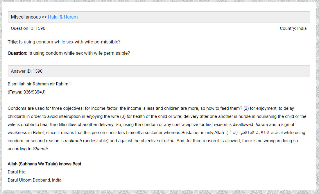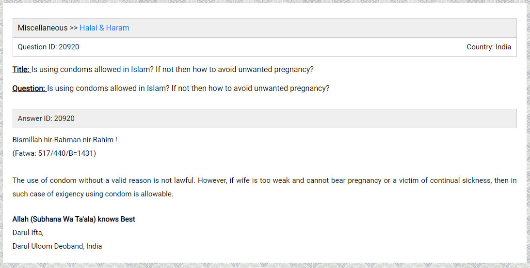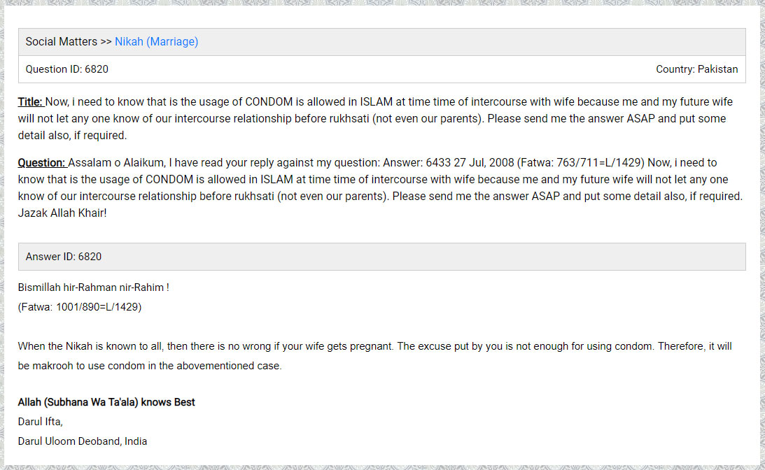 In another question asked on the website, Darul Ifta said that condom is only allowed if the couple wants to delay the next pregnancy to ensure the nourishment of the newborn child. However, if the couple wants to use the condom to avoid pregnancy as they are not well off, the use of a condom is not allowed as it would be considered a “weakness in belief”. Furthermore, if the couple wants to use a condom to delay childbirth to continue “enjoyment”, it would be considered Makrooh.