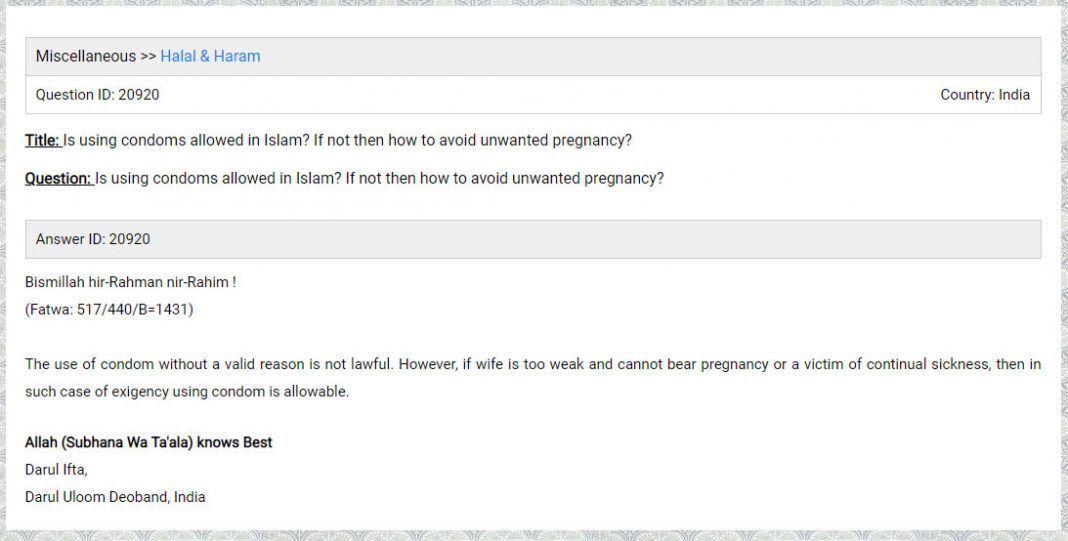 In a question submitted to the website, someone asked, “Is using condoms allowed in Islam? If not, then how to avoid unwanted pregnancy?” Darul Ifta, while answering the question, said, “The use of condoms without a valid reason is not lawful. However, if the wife is too weak and cannot bear pregnancy or a victim of continual sickness, then in such case of exigency, using a condom is allowable.”