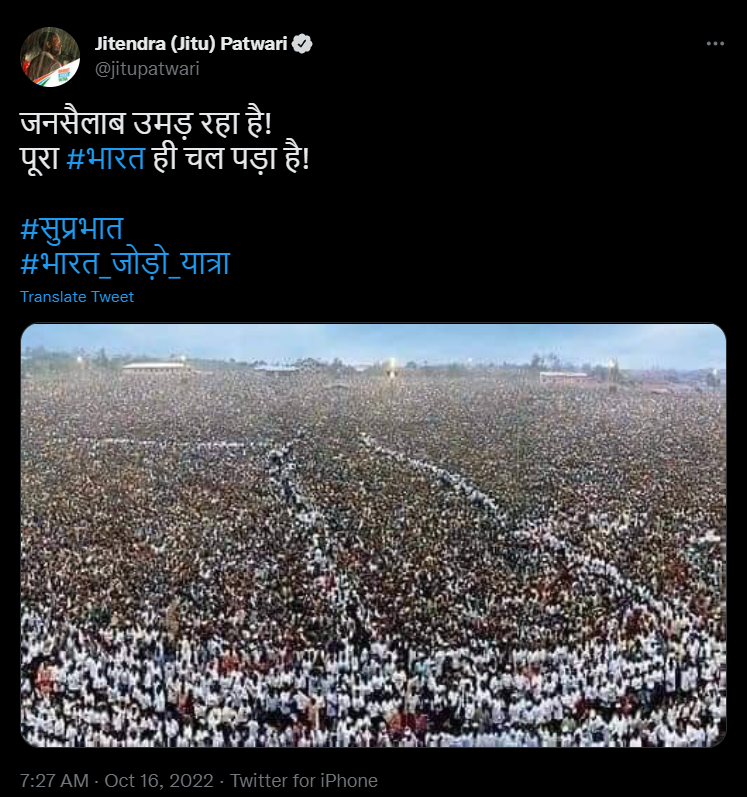 Jitendra Patwari, State President of the Madhya Pradesh Congress, uploaded a fake image of a huge crowd on Twitter and portrayed it as the multitude of people participating in Congress family scion and revered figure in the party Rahul Gandhi’s Bharat Jodo Yatra. Several social media users pointed this out in comments to the post by Jitendra Patwari.