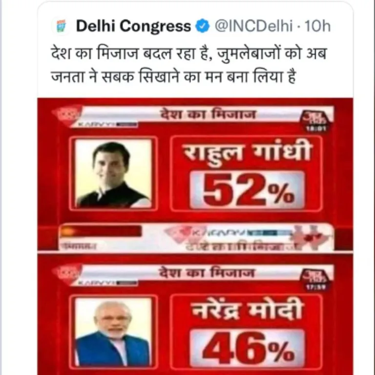 The Congress party praised its leader Rahul Gandhi on Thursday (October 13) morning for apparently surpassing Prime Minister Narendra Modi as the people’s choice, based on a fake poll credited to the news channel Aaj Tak. According to the ‘photoshopped survey,’ the Congress scion has a 52% approval rating, while Prime Minister Narendra Modi has a 46% approval rating.