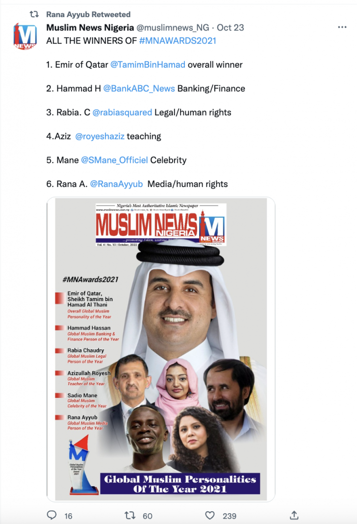 We, of course, got very curious about this award. After all, the team of ‘Muslim News’, a Nigeria based website which ‘is a mouthpiece for underreported Muslim achievers and events in Nigeria and across the world, which are never given prominence in the mainstream media,’ had chosen her after ‘rigorous deliberations. Apparently, as per the website, Rana is ‘voice of voiceless’ and has been “has been at the forefront of advocating for the rights of Muslims, especially the girl-child, who have been denied access to education due to ruthless hijab ban in many parts of India, the so-called world’s largest democracy.”