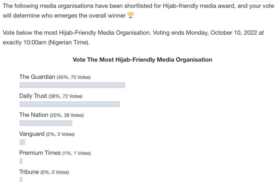The poll asked people to choose which media house allows them to promote Islam and its values. “Despite not having says in the editorial policies of their organisations, they are always pushing for informed narratives in their stories, both in print and online, especially when it comes to the issue of Hijab,” the website said about the hijabi journalists associated with these media houses.