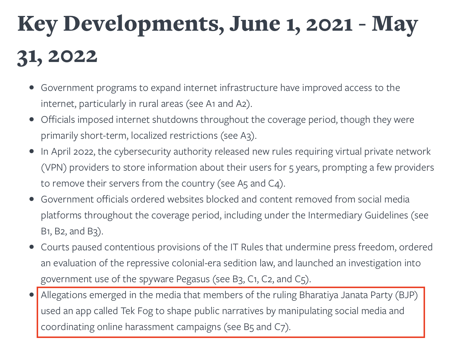 Freedom House, a dubious Human Rights ‘watchdog’ that supported violent protests against a law that gave citizenship rights to persecuted minorities like Hindus, Parsis, Sikhs, Buddhists and Christians from Islamic states neighbouring India, dropped the country from ‘free’ to ‘partly free’ in 2021. In 2022, too, the organisation maintained India as ‘partly free’, leaning on prejudiced reports and unfounded allegations, including The Wire’s story on Tek Fog, to claim that members of the BJP used it to shape public narratives and manipulate social media opinions.