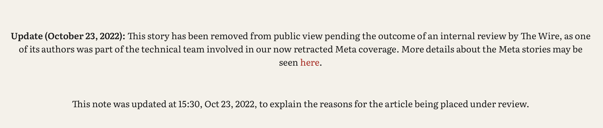 On October 23, 2022, The Wire retracted its stories on Tek Fog, with links to the Tek Fog stories on its website flashing a message. Here’s the screenshot of the message on one of the reports pulled down by The Wire.