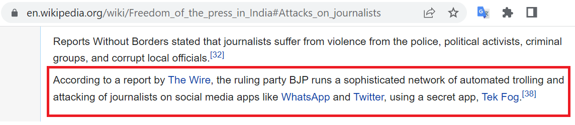 The Wire’s Tek Fog fabrications have also been used as a citation and proof on multiple articles on Wikipedia that paint India in a bad light. Such articles argue how freedom and democracy standards in India are falling and how the Modi government is solely responsible for it. For example, a Wikipedia article titled “Freedom of the press in India” cites The Wire to make this point.