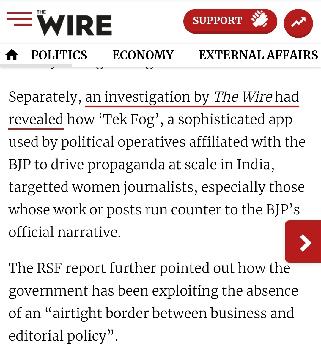 A report published in HW English cited the Tek Fog story by The Wire to highlight how it has played a part in downgrading India’s ranking from 142 last year to 150 in 2022. In fact, The Wire itself preened on its ‘investigation’ on Tek Fog, which is now suspected to be a case of pure fraud, when they reported on India’s downgrade on the Press Freedom Index earlier this year.