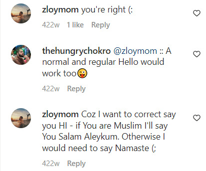 The Instagram user (@zloymom) continued, “Because I want to correct say you HI – if You are Muslim I’ll say You Salam Aleykum. Otherwise I would need to say Namaste.” Aftab responded, “A normal and regular Hello would work too.”