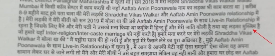 “My daughter had told my wife in 2019 that she wants to stay in a live-in relationship with Aftab Amin Poonawalla. I and my wife had said ‘No’ to it. This is because we are Hindus and belong to the Koli caste. And the boy is a Muslim,” the complaint read.