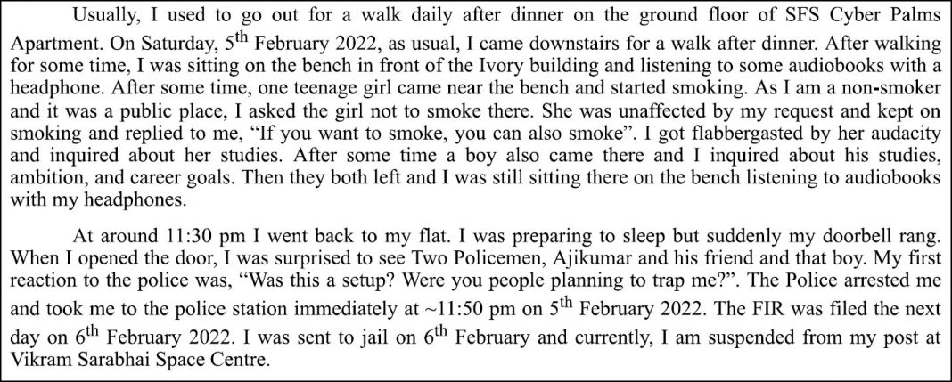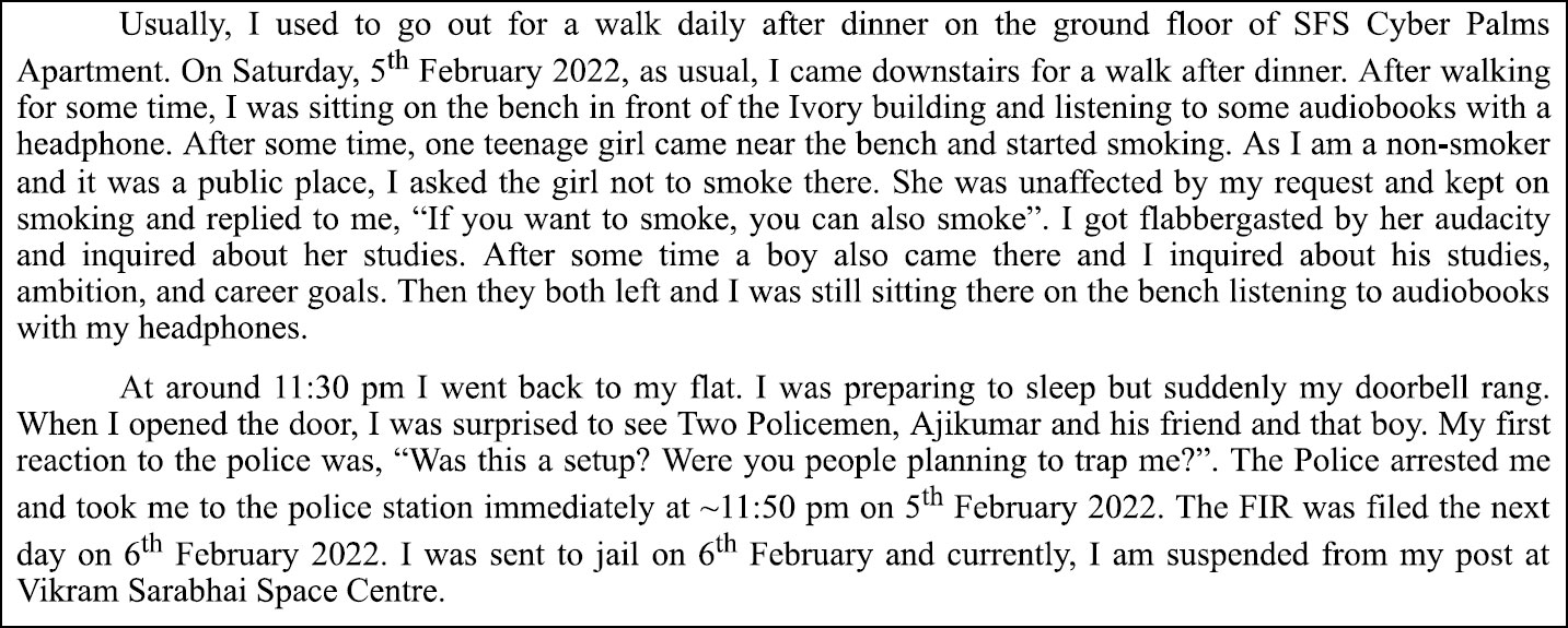 The situation did not strike as unusual at first, but he was met with a shock when at around 11:30 PM, police came to his doorstep. He said, “I was preparing to sleep, but suddenly my doorbell rang. When I opened the door, I was surprised to see Two Policemen, Ajikumar and his friend and that boy. My first reaction to the police was, “Was this a setup? Were you people planning to trap me?” The Police arrested me and took me to the police station immediately at around 11:50 PM on February 5 2022. The FIR was filed the next day, February 6 2022. I was sent to jail on February 6, and currently, I am suspended from my post at Vikram Sarabhai Space Centre.”