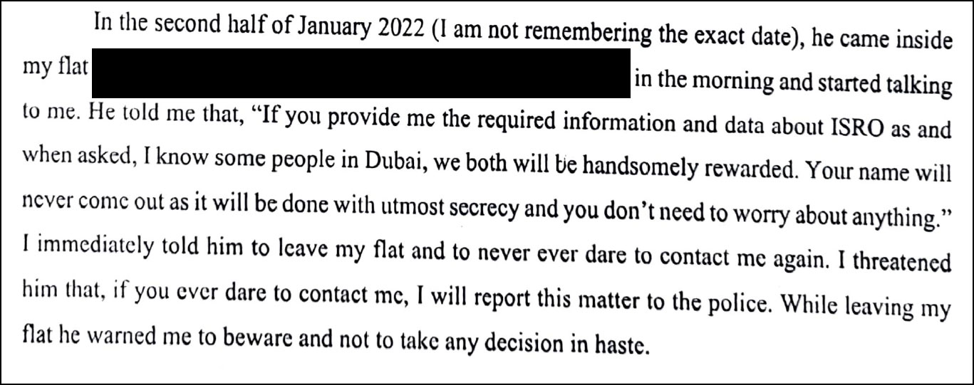 A few days later, Ajitkumar again met him and asked more questions about ISRO, its missions and projects. This time, Maurya refused to answer his questions. In the second half of January 2022, he visited Maurya’s flat and said, “If you provide me with the required information and data about ISRO as and when asked, I know some people in Dubai, we both will be handsomely rewarded. Your name will never come out as it will be done with utmost secrecy, and you don’t need to worry about anything.”