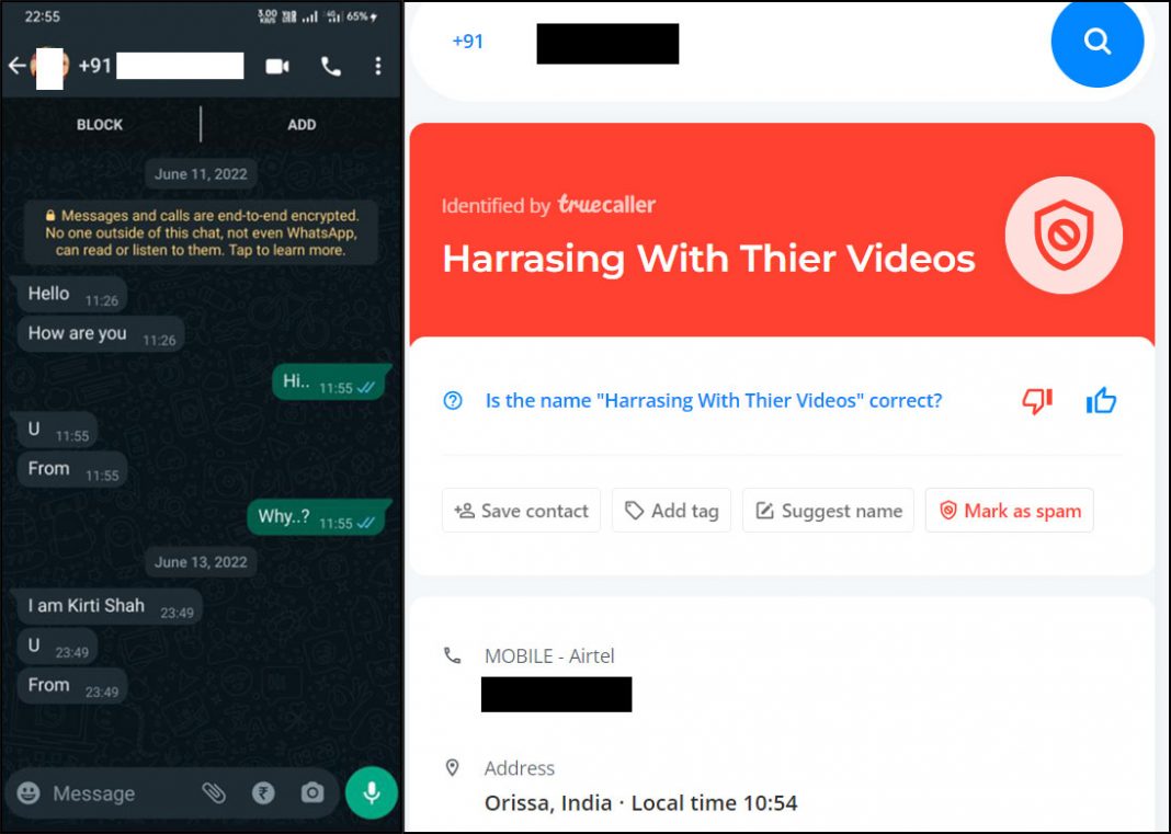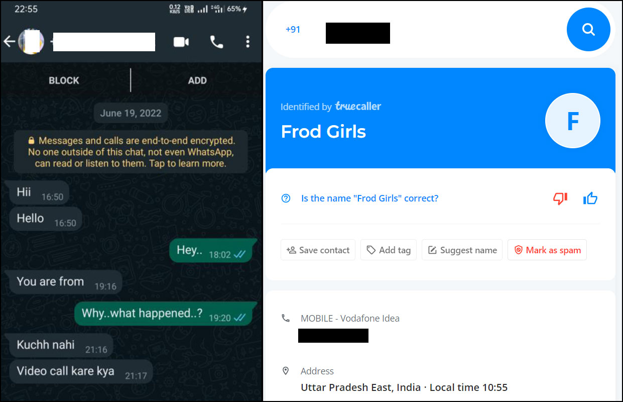 There were eight numbers from which Maurya received messages and requests to have video calls. When we checked those numbers, some were spam and fraudulent. One of the numbers was saved by someone as “Frod Girls”. Another number was saved as “Harassing with their videos”. Three out of eight numbers were marked as spam. Screenshots of the chats and Truecaller search are added below.