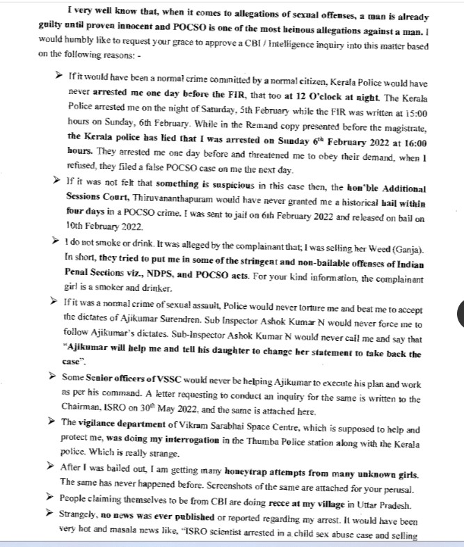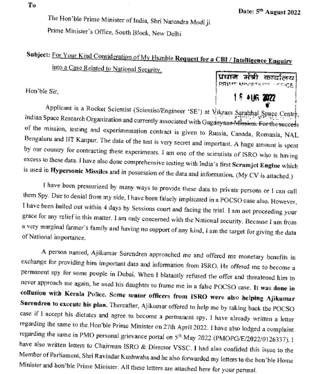 In his letter to the PM of India, Praveen Maurya detailed how the Kerala police and some officers of ISRO implicated him in false POCSO and NDPS charges and how he was intimidated and harassed for not succumbing to the espionage demands.