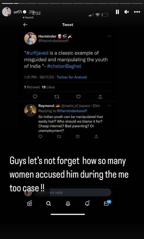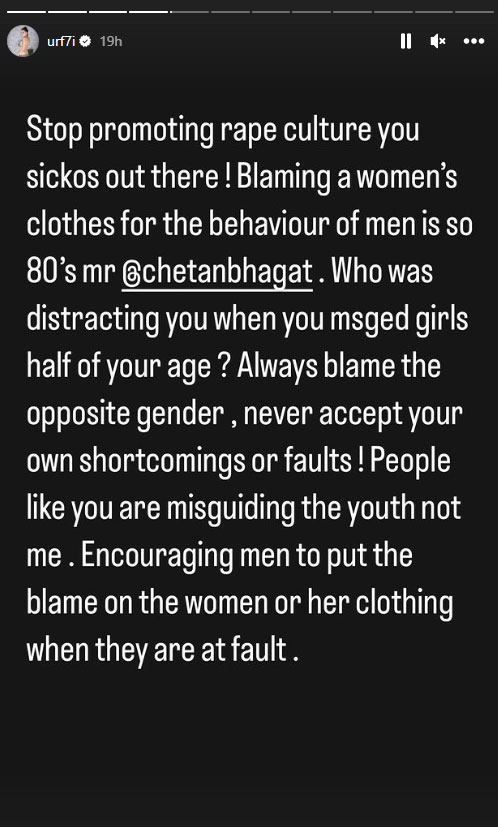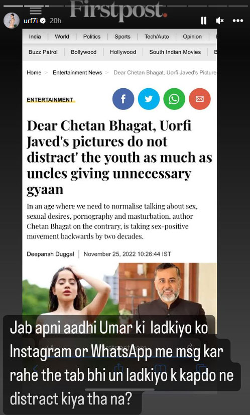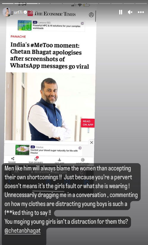 The remarks passed by the author did not garner many headlines or attract a reaction from Uorfi. However, following an op-ed in Firstpost where the author called out Bhagat for the remarks that were published on November 25, it seems to have got the attention of the actress. In a series of stories, Uorfi lashed out at Bhagat.