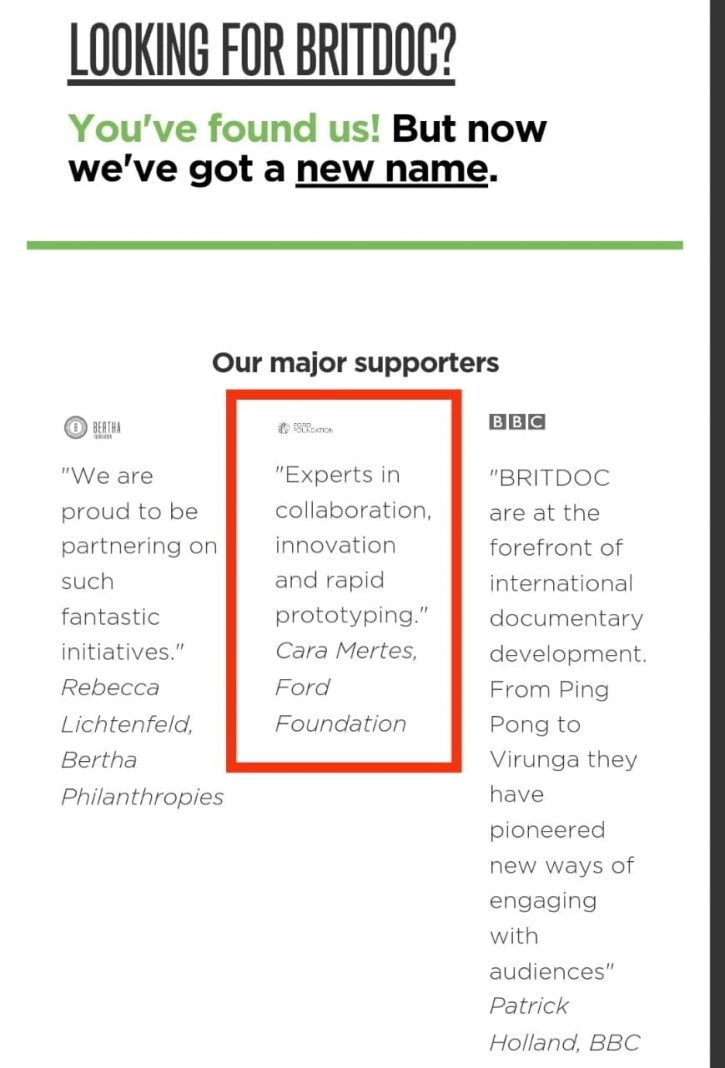 The site also included a quote from the ex-director of Ford Foundation’s ‘JustFilms initiative’, wherein she heaped praise on the Doc Society. “Experts in collaboration, innovation and rapid prototyping,” Cara Mertes was quoted as saying.