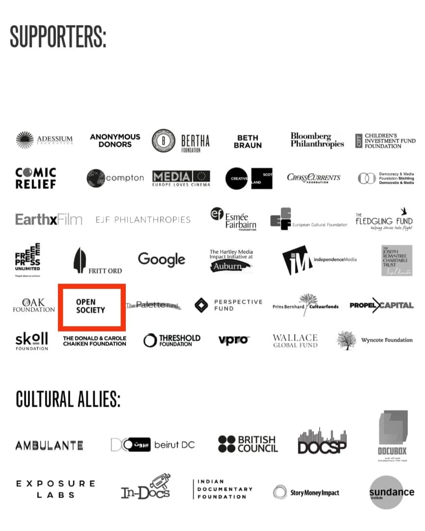 Amongst the several dozen ‘supporters’ of Doc Society, the Open Society Foundations of American billionaire George Soros stands out as one of the prominent organisations funding the non-profit company.