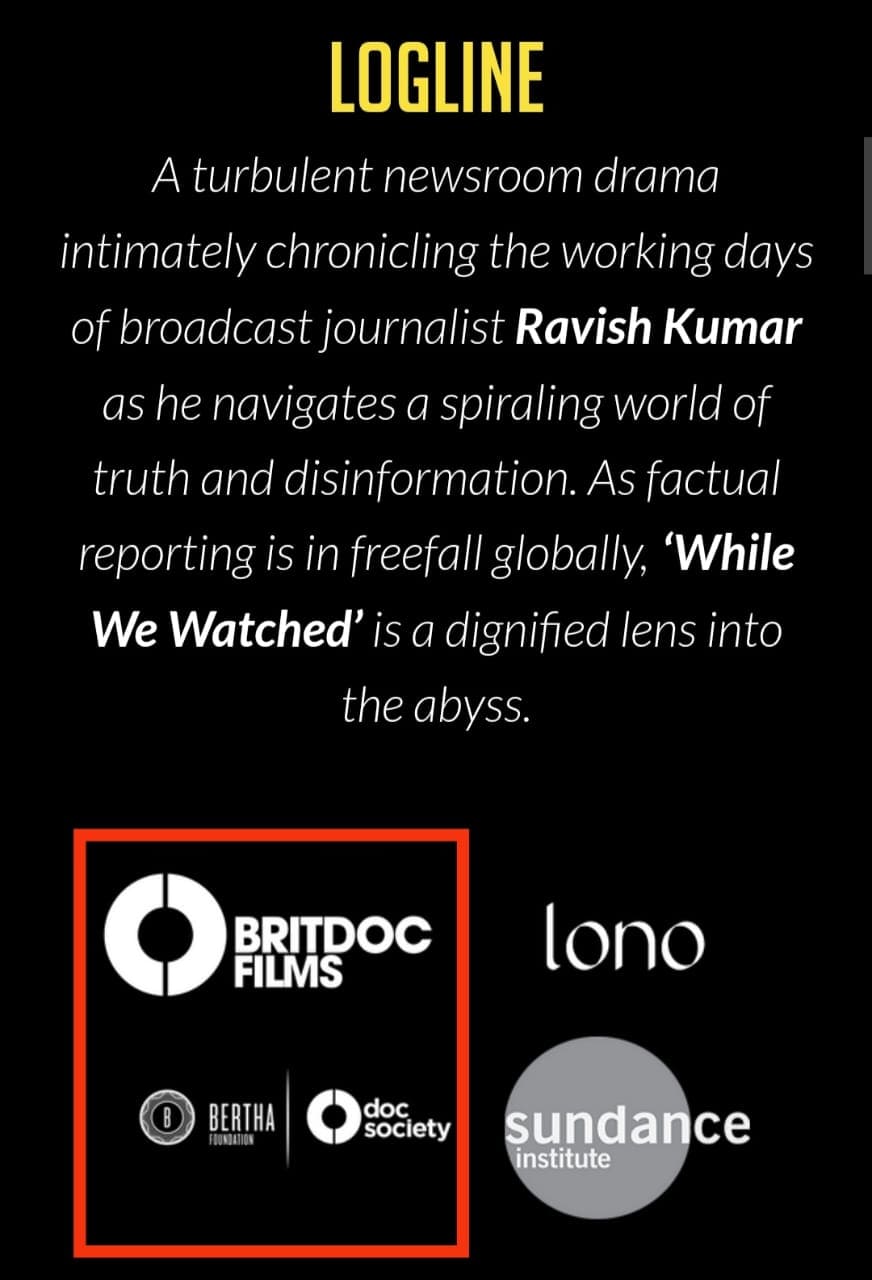 The logline of the documentary claimed, “A turbulent newsroom drama intimately chronicling the working days of broadcast journalist Ravish Kumar as he navigates a spiralling world of truth and disinformation. As factual reporting is in freefall globally, ‘While We Watched’ is a dignified lens into the abyss.”