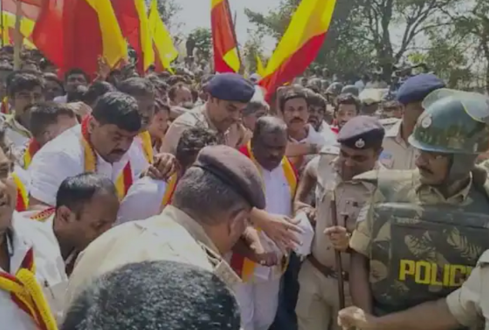 #WATCH | Karnataka: Police detain workers of Karnataka Rakshana Vedike, at Hire Bagewadi in Belagavi, after they pelted stones on a truck and stopped trucks which had registration done in Maharashtra. They also staged a sit-in protest. pic.twitter.com/FdNZ6sfdsW