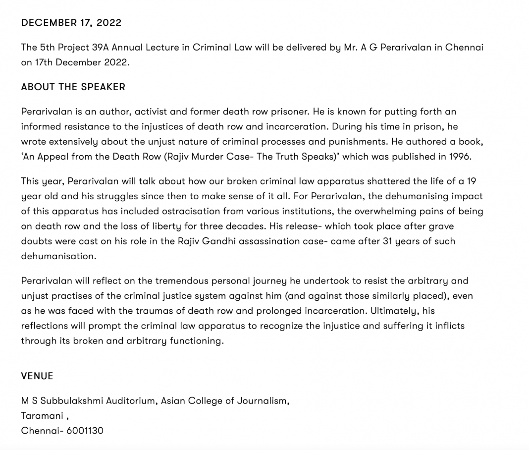 According to the Project 39A website, the lecture is supposed to be held on the 17th of December at the MS Subbulakshmi auditorium at the Asian College of Journalism.