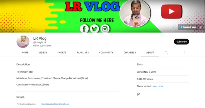 Interestingly, Minister Tej Pratap Yadav’s picture has been used as a display picture of the channel which was created on November 6, 2021. At present, it has 65,600 subscribers. There are many videos published on it, which have been produced by Tej Pratap Yadav himself. In several videos, he can also be heard saying, “Namaskar, you are watching LR Vlog and I am Tej Pratap Yadav.”