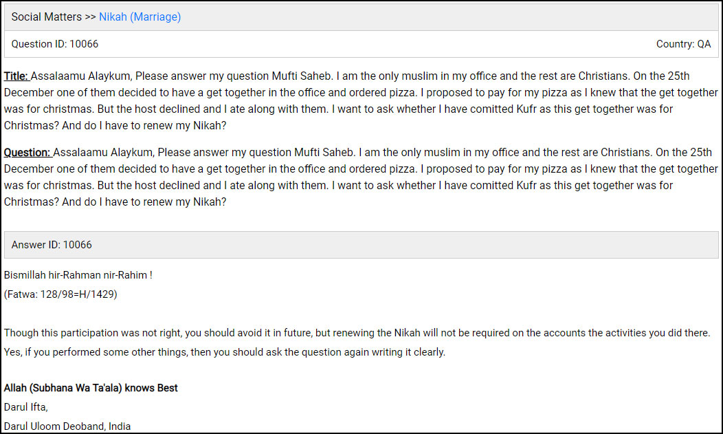 In his question to the Mufti at Darul Uloom Deoband, the person said that he was the only Muslim in his office and that the rest of the people were Christians. One of his colleagues ordered pizza on Christmas to celebrate the festival. The Muslim person seeking a reply offered to pay for his share, but his colleague refused to take it, and he ate the pizza anyway. As he celebrated another religion’s festival, he was scared that he might have committed ‘kufr’. Furthermore, he was confused if his Nikah was deemed invalid by committing ‘Kufr’, and whether he had to renew it.