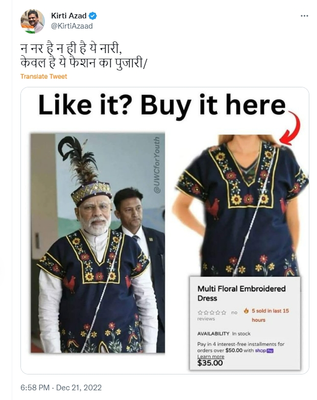 It is notable that Kirti Azad also wrote a derogatory caption while sharing this image on Twitter. Kirti Azad wrote, “It’s neither male nor female. It’s just the priest of fashion.” Apparently, Kirti Azad called the Prime Minister to be a transgender person or a cross-dresser. In his tweet, Azad posted an image containing a photograph of PM Modi in the Khasi attire, and deside it there was an image purportedly showing that the attire the PM is wearing is actually ladies’ wear which is available for online sale at a lucrative discount on an e-commerce platform.