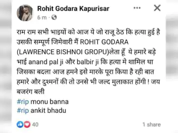 “I, Rohit Godara (Lawrence Bishnoi Gang), take responsibility for the murder of Raju Theth. He was involved in the murder of our big brothers Anand Pal Ji and Balbir Ji. We took revenge by killing him. Whereas our other enemies are concerned, we will meet them soon,” Rohit Godara wrote in the Facebook post.