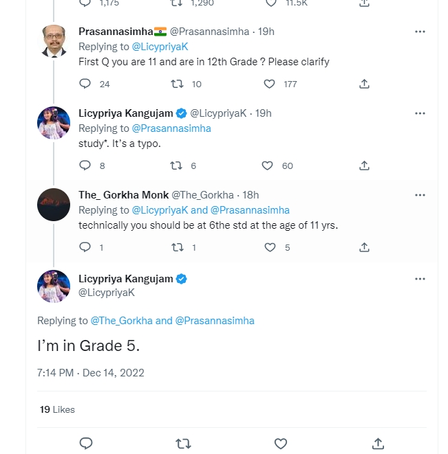 In her tweets, Lycypriya said that she is 11 years old and she “studied in a school with free merit scholarship till Grade 12.” This raises obvious questions, a 11 year old can’t be studying in grade 12. When people started to question her on it, she ‘clarified’ that it is was a typo and it should be ‘study’, not ‘studied’. She said that she is currently studying in class 5, and she meant that she has scholarship till class 12th.