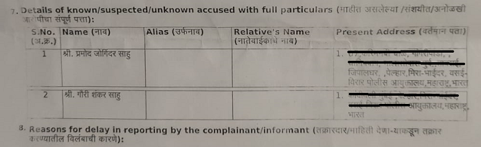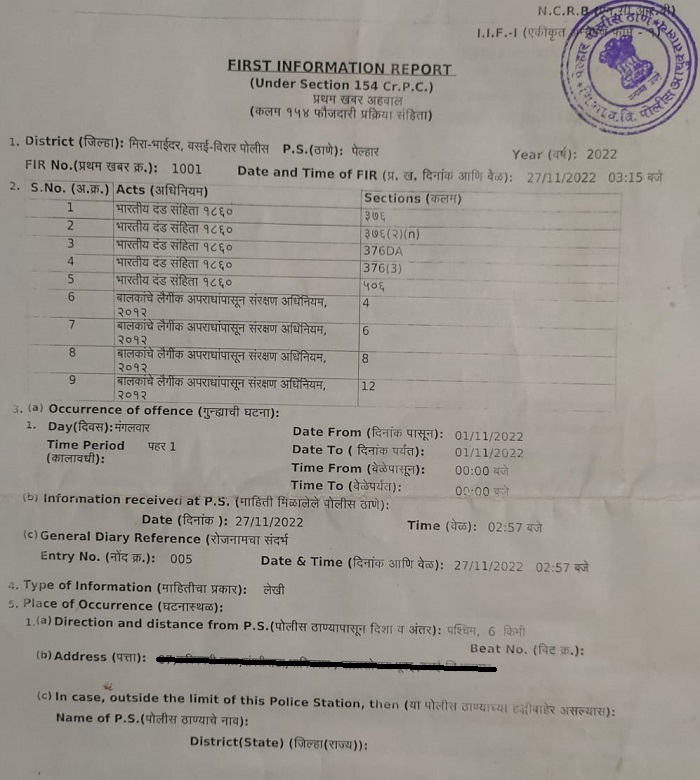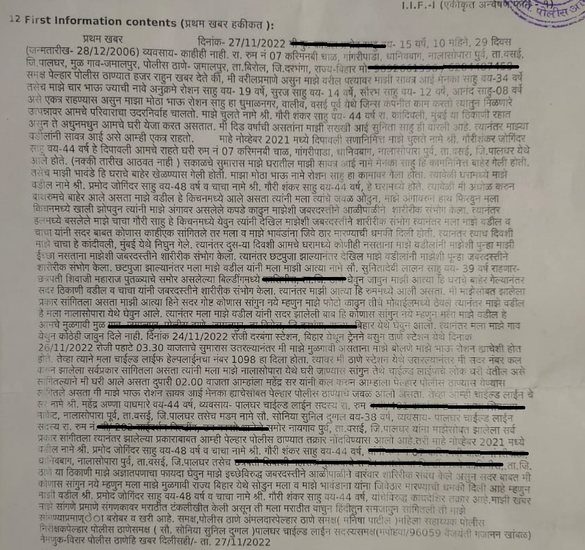 According to the FIR copy obtained by OpIndia, the sexual abuse of the girl started on November 1 of this year, but the case was registered on November 27 as the girl had been forcefully taken by the father to their native home in Bihar after the assault. The primary accused in the case, Pramod Joginder Sahu (48), is a resident of Nalasopara, Vasai, and the second accused named in the case named, Gauri Shankar Sahu (44), is a resident of Kandivali, Mumbai.