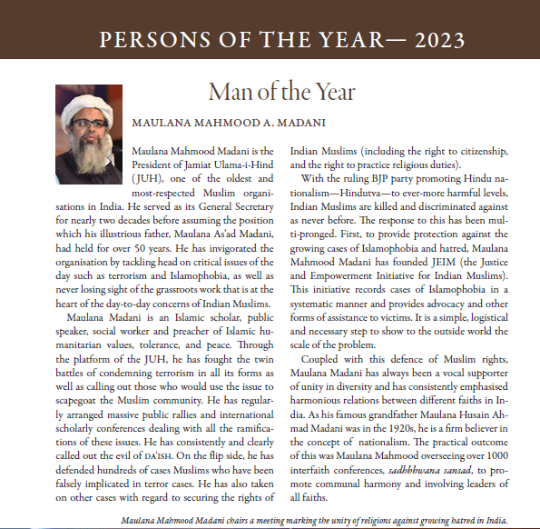The independent research entity recently published the 14th annual issue [pdf] of ‘The Muslim 500: The World’s 500 Most Influential Muslims’ wherein Maulana Mahmood Madani is listed as the ‘Person of the Year- 2023.’